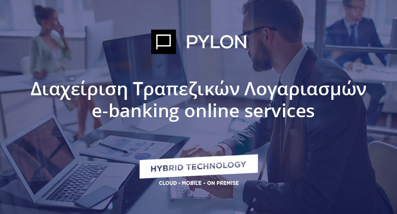 Με την υπηρεσία PYLON, e-Banking Online Services καλύπτονται οι εξειδικευμένες επιχειρηματικές ανάγκες κάθε σύγχρονης και αναπτυσσόμενης επιχείρησης με απλό, εύχρηστο και αξιόπιστο τρόπο. Επιπλέον, εξασφαλίζεται η άμεση πρόσβαση στις κινήσεις τραπεζικών λογαριασμών σε πραγματικό χρόνο και ταυτόχρονα καθίσταται εφικτή η σύνδεση τραπεζικών κινήσεων με παραστατικά των εφαρμογών με αλγορίθμους έξυπνης αντιστοίχισης, αλλά και η αυτόματη δημιουργία παραστατικού από την τραπεζική κίνηση.