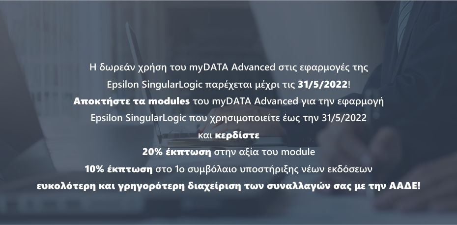 Η χρήση του module “myDATA Advanced” προσφέρει λειτουργικές ευκολίες κατά τη διαδικασία ενημέρωσης της πλατφόρμας myDATA της ΑΑΔΕ, την οποία παρέχουν οι ανωτέρω εφαρμογές της Epsilon SingularLogic.
